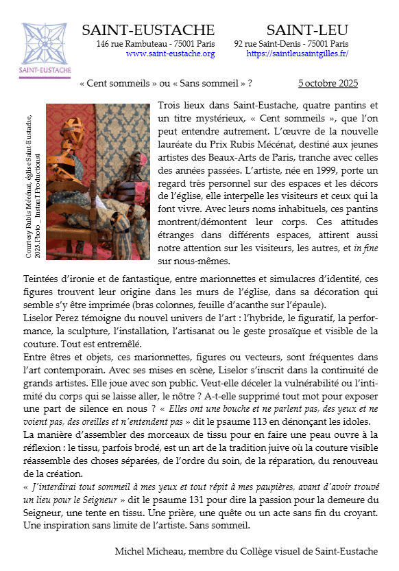Trois lieux dans Saint-Eustache, quatre pantins et un titre mystérieux, « Cent sommeils », que l’on peut entendre autrement. L’œuvre de la nouvelle lauréate du Prix Rubis Mécénat, destiné aux jeunes artistes des Beaux-Arts de Paris, tranche avec celles des années passées. L’artiste, née en 1999, porte un regard très personnel sur des espaces et les décors de l’église, elle interpelle les visiteurs et ceux qui la font vivre. Avec leurs noms inhabituels, ces pantins montrent/démontent leur corps. Ces attitudes étranges dans différents espaces, attirent aussi notre attention sur les visiteurs, les autres, et in fine sur nous-mêmes.