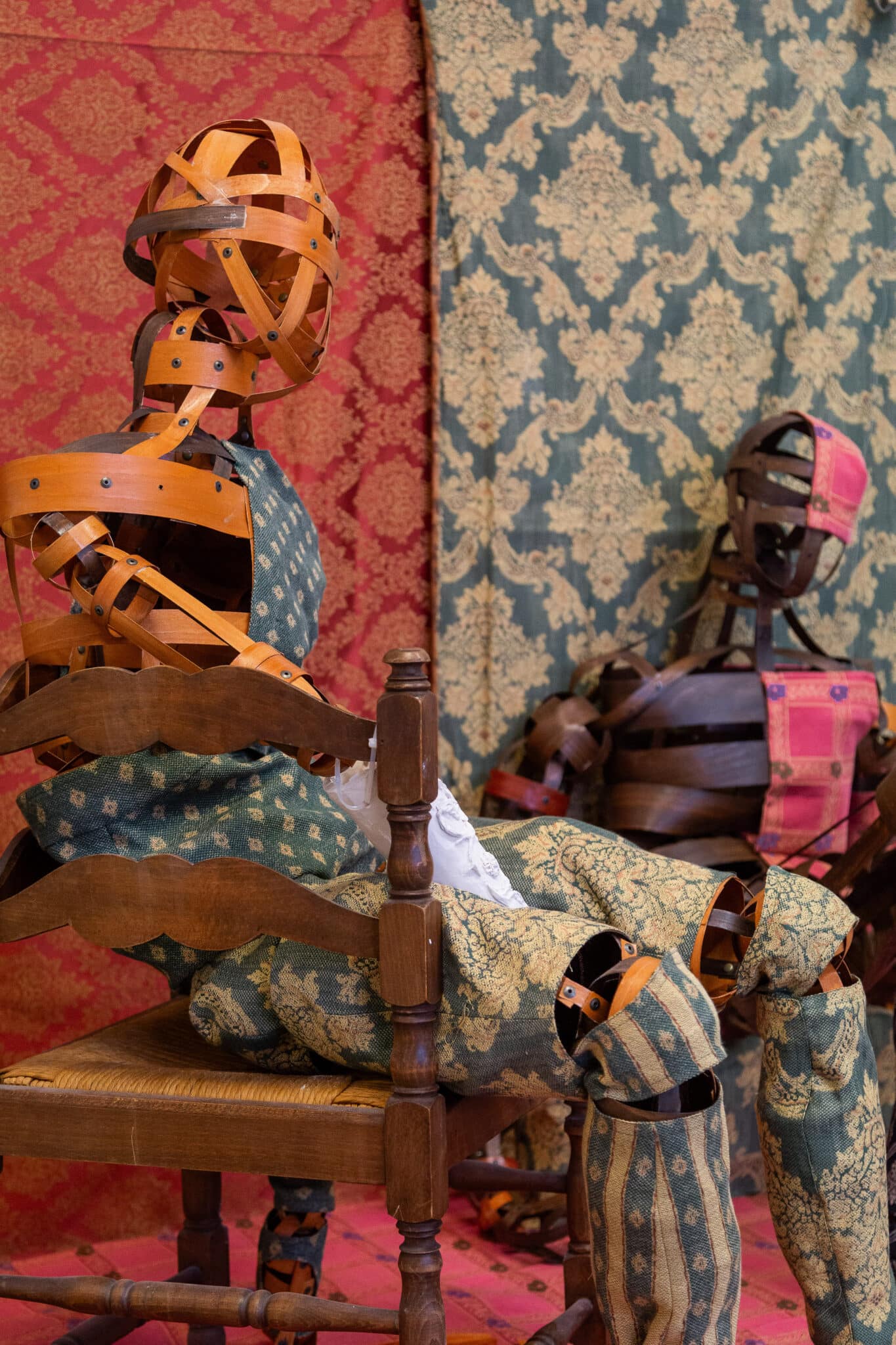 Teintées d’ironie et de fantastique, entre marionnettes et simulacres d’identité, ces figures trouvent leur origine dans les murs de l’église, dans sa décoration qui semble s’y être imprimée (bras colonnes, feuille d’acanthe sur l’épaule).