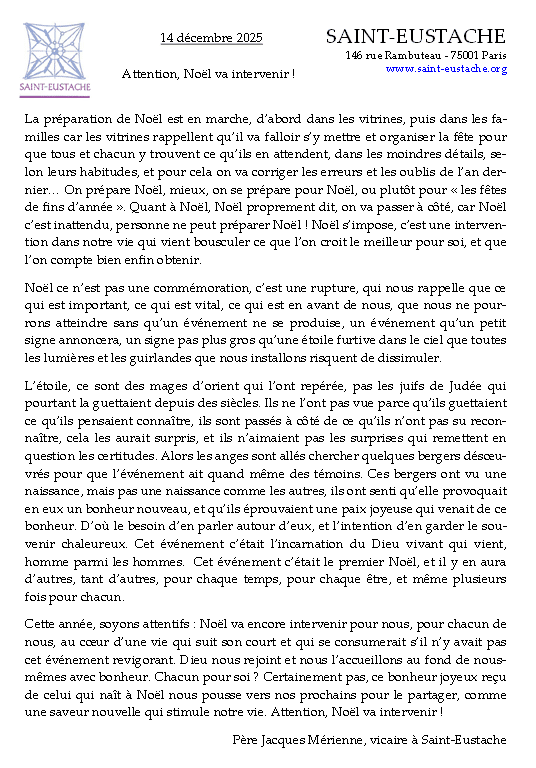Cette année, soyons attentifs : Noël va encore intervenir pour nous, pour chacun de nous, au cœur d’une vie qui suit son court et qui se consumerait s’il n’y avait pas cet événement revigorant. Dieu nous rejoint et nous l’accueillons au fond de nous-mêmes avec bonheur. Chacun pour soi ? Certainement pas, ce bonheur joyeux reçu de celui qui naît à Noël nous pousse vers nos prochains pour le partager, comme une saveur nouvelle qui stimule notre vie. Attention Noël va intervenir !