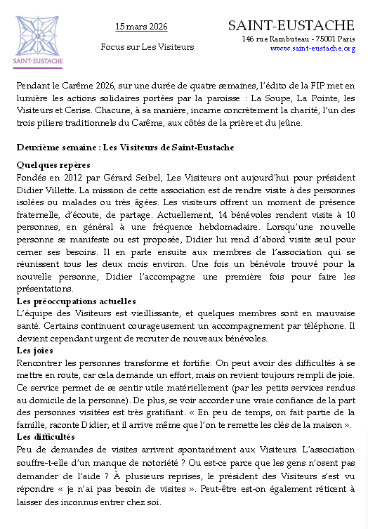 Pendant le Carême 2026, sur une durée de quatre semaines, l’édito de la FIP met en lumière les actions solidaires portées par la paroisse : La Soupe, La Pointe, les Visiteurs et Cerise. Chacune, à sa manière, incarne concrètement la charité, l’un des trois piliers traditionnels du Carême, aux côtés de la prière et du jeûne.